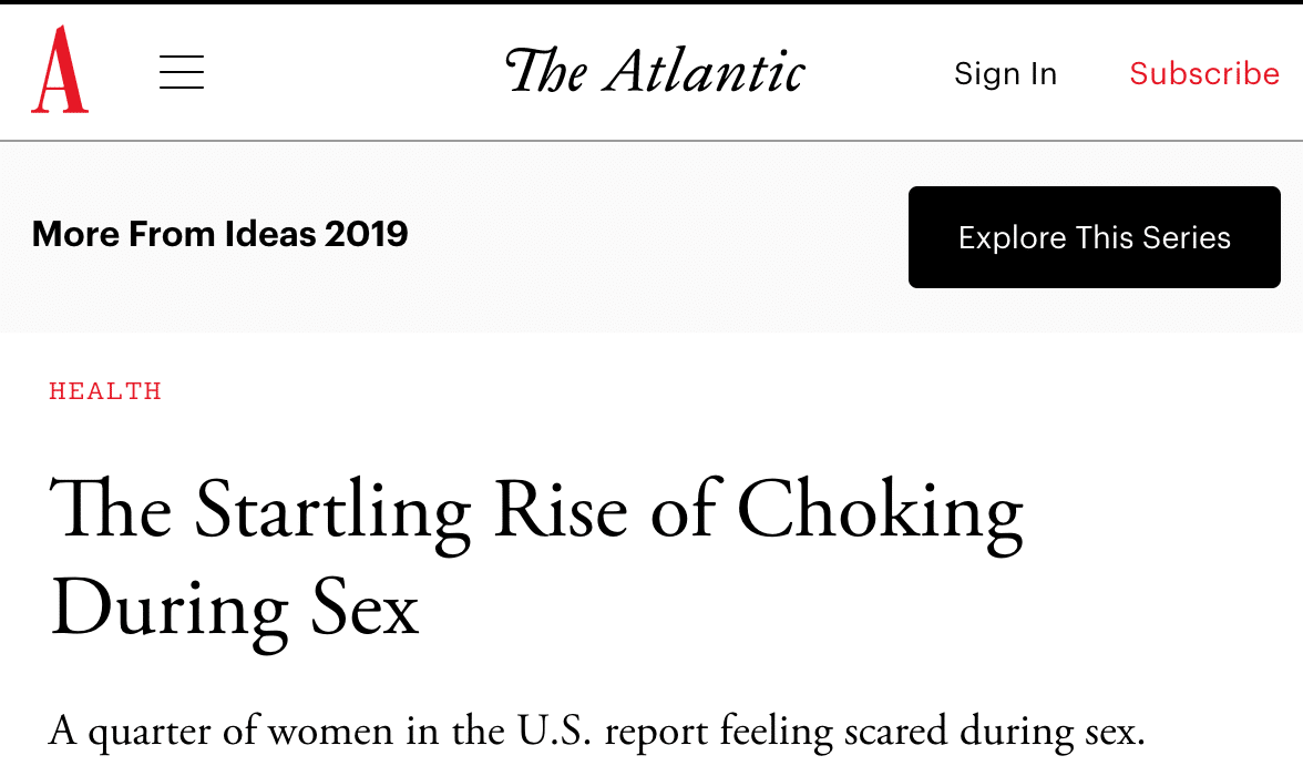 In 2019, The Atlantic published a story with the nauseating headline, “The Startling Rise of Choking During Sex.” The subheadline notes that “a quarter of women in the U.S. reporting feeling scared during sex.” In one study involving 347 participants, 23 said that their partners have tried to choke them “unexpectedly” during sex. Women are also reporting a rise in a variety of other violent sexual behaviors – many of which are too disturbing and graphic to describe here.
