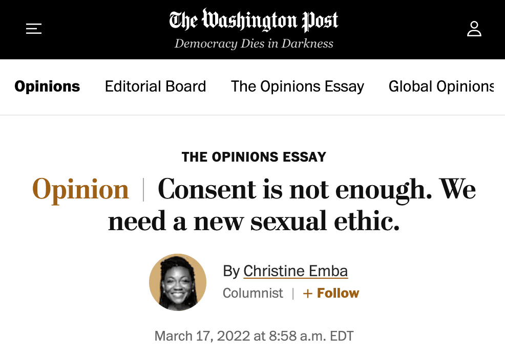 The Washington Post published a remarkable essay calling for the development of a “new sexual ethic.” As the author, Christine Emba, argues, instead of the modern sexual ethic that judges sexual encounters based upon “consent” alone, what we need is a new ethic that will advocate such things as sex within a context of “listening,” “care,” and “mutual responsibility.”